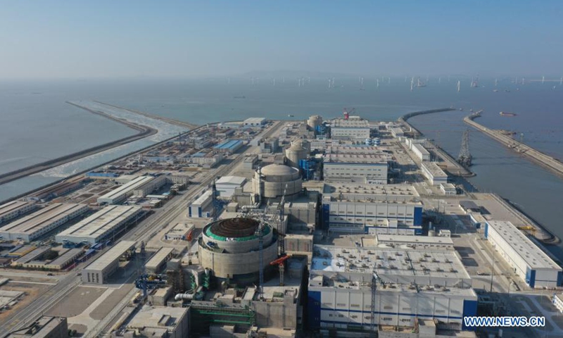 Aerial photo taken on Jan. 30, 2021 shows a view of Fujian Fuqing Nuclear Power Co., Ltd., a subsidiary of the China National Nuclear Corporation (CNNC), in Fuqing, southeast China's Fujian Province. China's first nuclear power unit using Hualong One, a domestically-designed third-generation nuclear reactor, has entered commercial operation, said the CNNC Saturday. The No. 5 unit in Fuqing is generating electricity for sale after a seven-day trial run. (Xinhua/Lin Shanchuan)