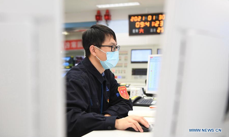 A staff member works at the control room of the No. 5 nuclear power unit in the city of Fuqing, southeast China's Fujian Province, Jan. 30, 2021. China's first nuclear power unit using Hualong One, a domestically-designed third-generation nuclear reactor, has entered commercial operation, said the China National Nuclear Corporation (CNNC) Saturday. The No. 5 unit in Fuqing is generating electricity for sale after a seven-day trial run. (Xinhua/Lin Shanchuan)