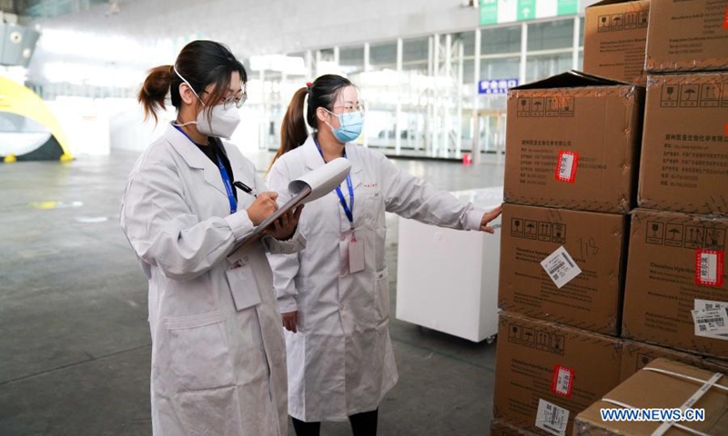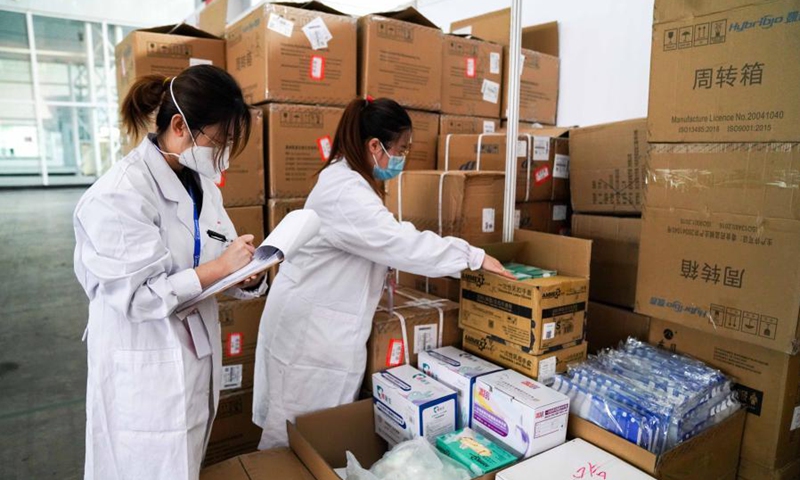 Medical members from the Fourth Affiliated Hospital of Harbin Medical University count medical materials in the reserve area of the "Huoyan" nucleic acid test laboratory in Harbin, northeast China's Heilongjiang Province, Jan. 30, 2021. The "Huoyan" laboratory will soon be put into use to fight the COVID-19 pandemic in Harbin. (Xinhua/Wang Song)