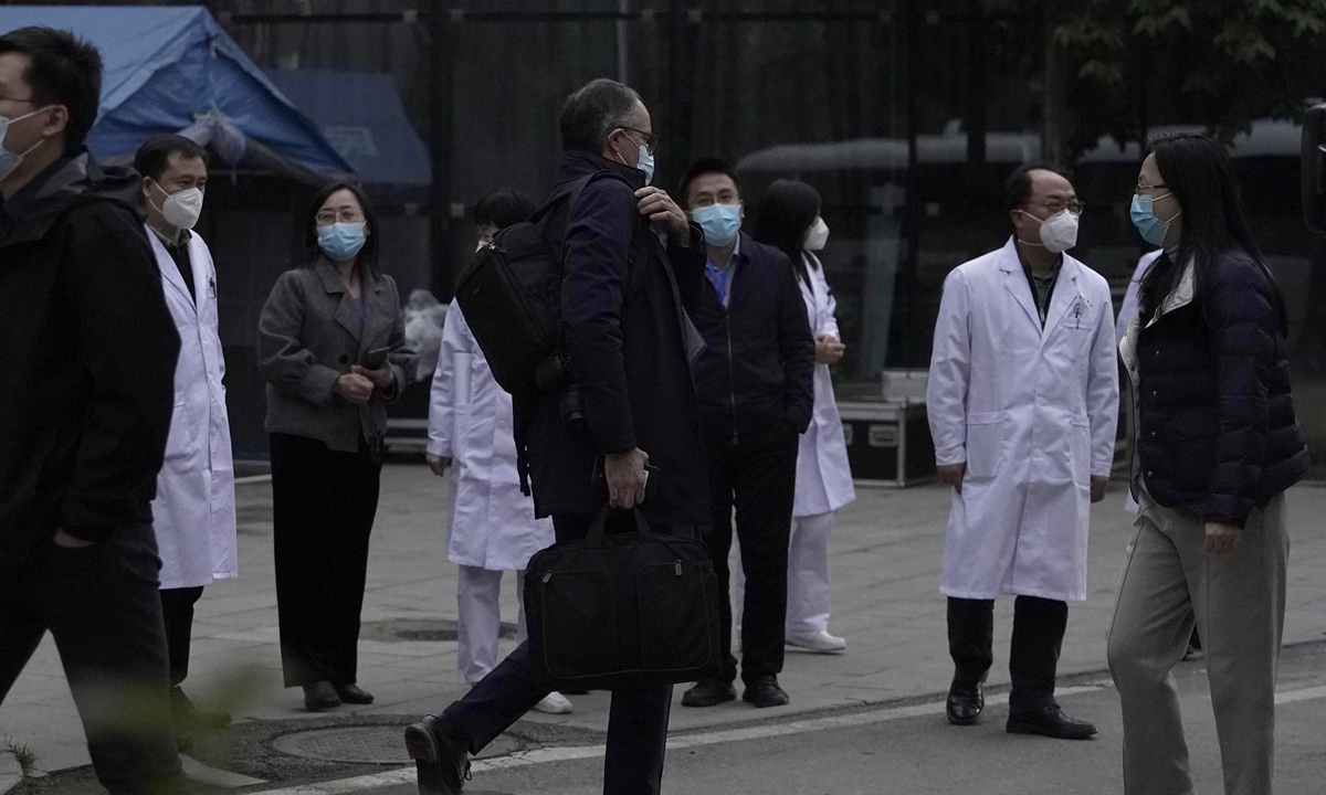 Peter Ben Embarek (center) of the World Health Organization research team passes by Chinese doctors during a visit to the Hubei Provincial Hospital of Integrated Chinese and Western Medicine, also known as the Hubei Province Xinhua Hospital, in Wuhan, Central China's Hubei Province on Friday. Photo: AP