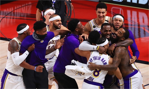 Anthony Davis (No.3) of the Los Angeles Lakers grabs a rebound against the Boston Celtics on Saturday in Boston, Massachusetts. Photo: VCG