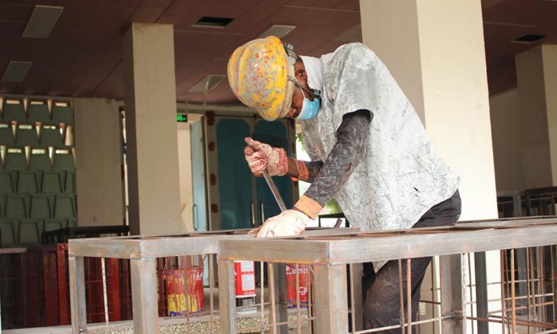 A Beninese welder works at the renovation site of the Friendship Stadium in Cotonou, Benin, Jan. 29, 2021. The renovation project is expected to be finished in May 2021. (Photo by Seraphin Zounyekpe/Xinhua)