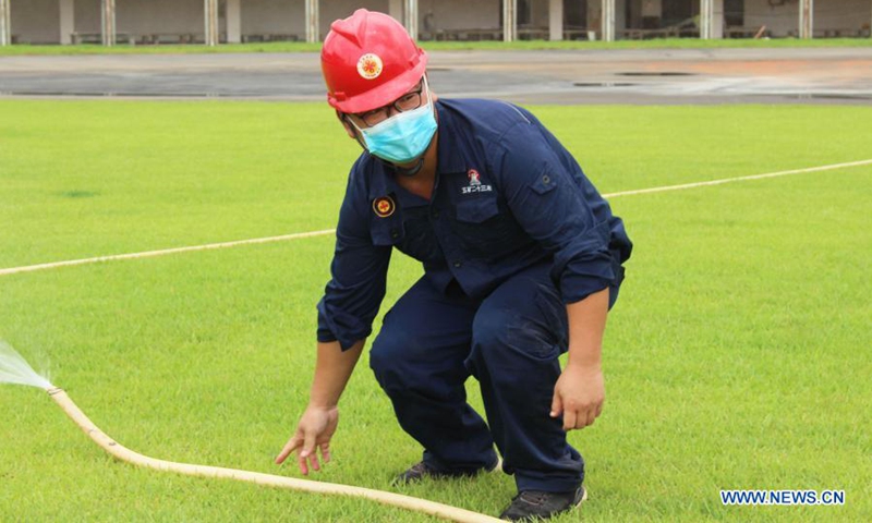 A Chinese worker waters the lawn at the renovation site of the Friendship Stadium in Cotonou, Benin, Jan. 29, 2021. The renovation project is expected to be finished in May 2021. (Photo by Seraphin Zounyekpe/Xinhua)