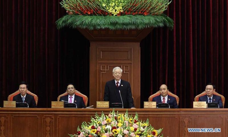 Photo taken on Jan. 31, 2021 shows the scene at the first meeting of the 13th Communist Party of Vietnam Central Committee (CPVCC), where Nguyen Phu Trong was re-elected as general secretary of the CPVCC in Hanoi, Vietnam.(VNA via Xinhua)