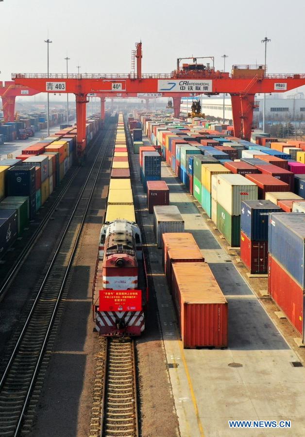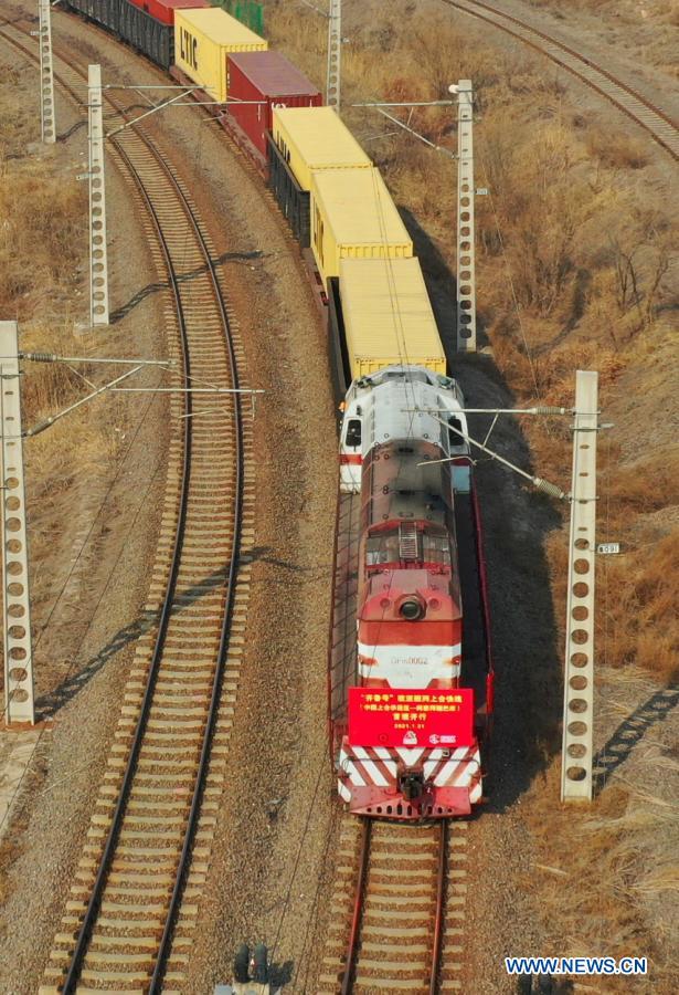 Aerial photo taken on Jan. 31, 2021 shows the first "Qilu" freight train running from Jiaozhou, east China's Shandong province, to Baku, capital of Azerbaijan in Jiaozhou, Jan. 31, 2021. A freight train carrying 100 twenty-foot equivalent unit (TEU) containers' goods such as tires and air conditions left Jiaozhou on Sunday, marking the launch of "Qilu" freight train services from Jiaozhou to Baku. (Photo by Wang Zhaomai/Xinhua)