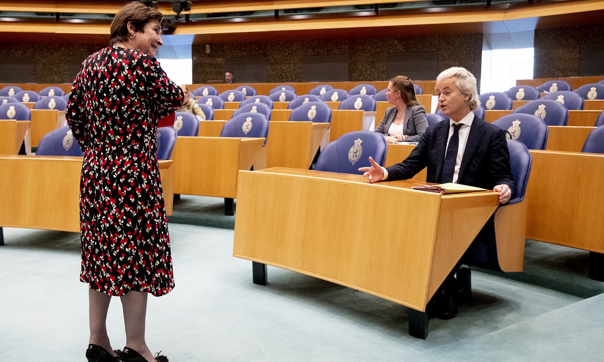 PvdA leader Lilianne Ploumen and PVV leader Geert Wilders seen talking during the debate in the Tweede Kamer parliament about the intended lockdown curfew on January 21, 2021 in The Hague, Netherlands. Photo: VCG