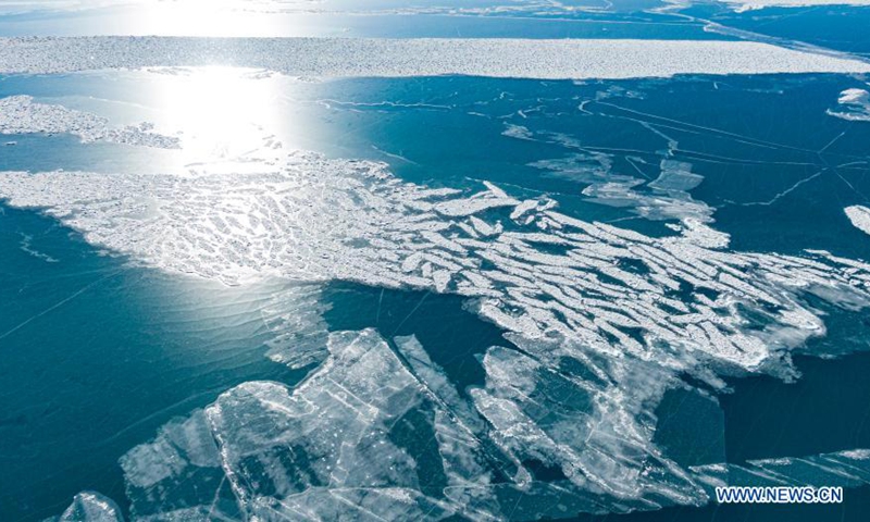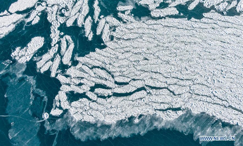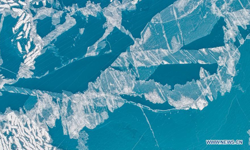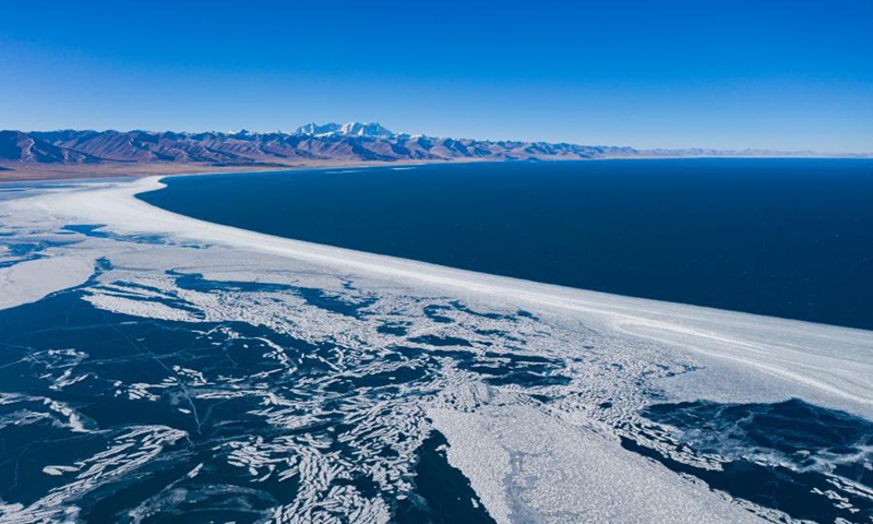 Aerial photo taken on Jan. 29, 2021 shows the winter scenery of Nam Co Lake in southwest China's Tibet Autonomous Region. (Xinhua/Jigme Dorje)