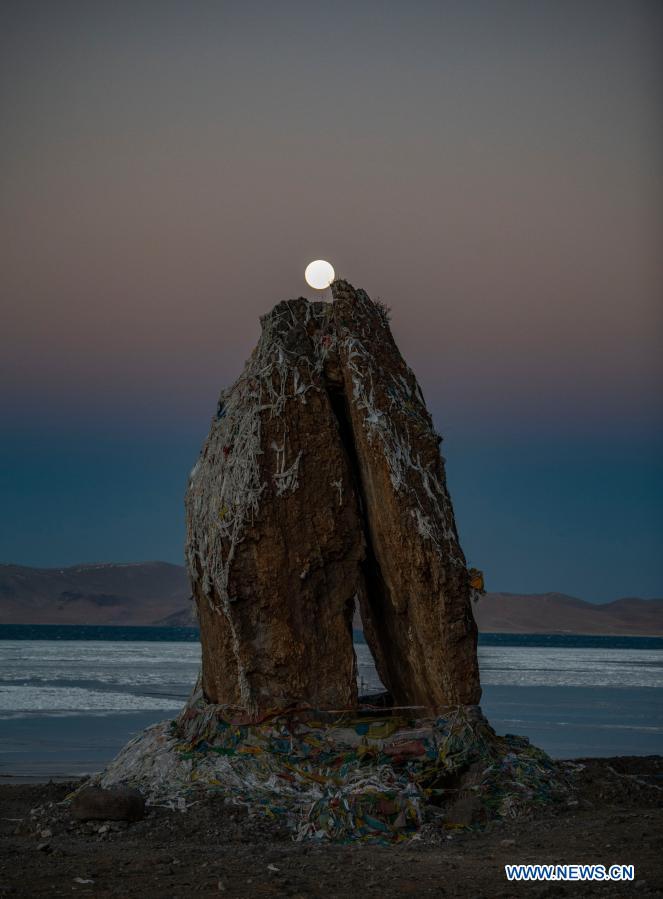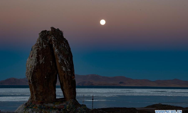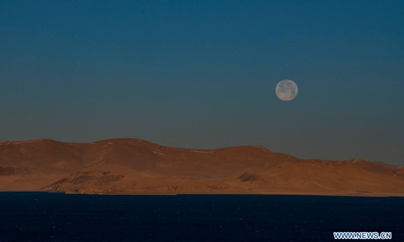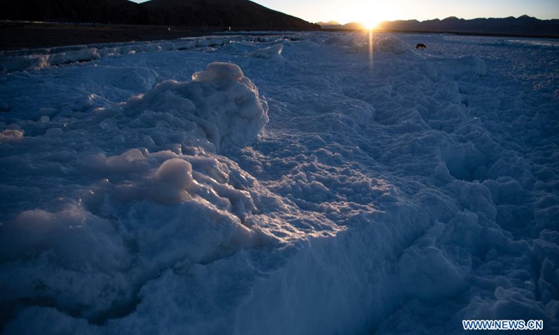 Photo taken on Jan. 29, 2021 shows the winter scenery of Nam Co Lake at dawn in southwest China's Tibet Autonomous Region. (Xinhua/Sun Fei)