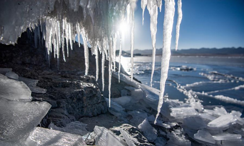 Cellphone photo taken on Jan. 29, 2021 shows the winter scenery of Nam Co Lake in southwest China's Tibet Autonomous Region. (Xinhua/Purbu Zhaxi)