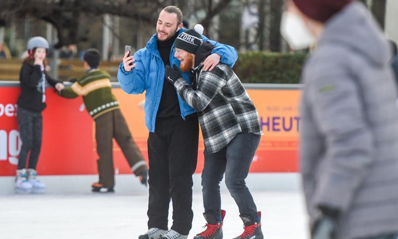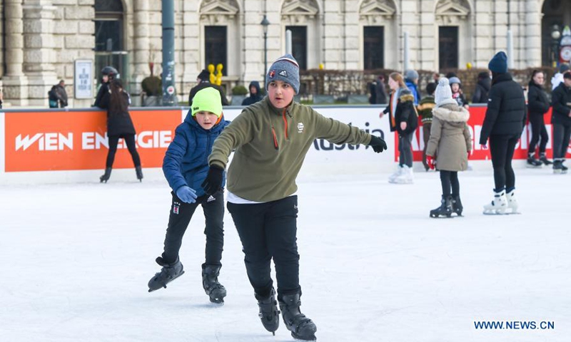 People skate at Rathausplatz in Vienna, Austria, on Jan. 31, 2021. Viennese Ice Dream in Rathausplatz is one of the few open-air events that remain open during pandemic restrictions. Many people enjoy this annual event since 1996. (Xinhua/Guo Chen)