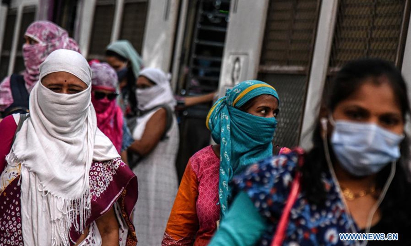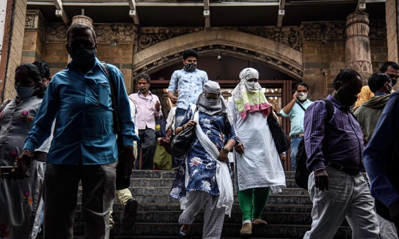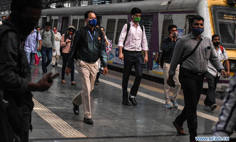 People walk out of a train station in Mumbai, India, on Feb. 1, 2021. (Photo by Fariha Farooqui/Xinhua)
