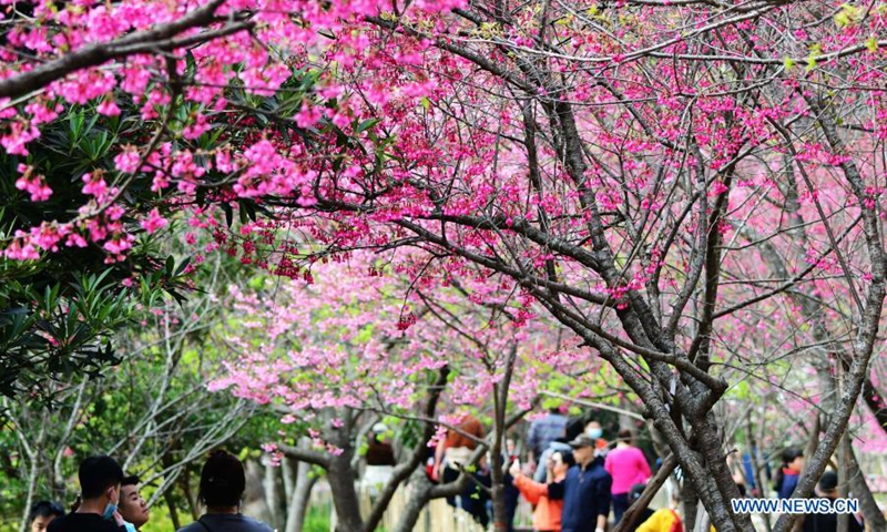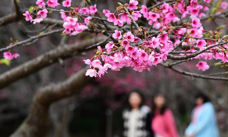 Visitors enjoy their leisure time among cherry blossoms at Fuzhou National Forest Park in Fuzhou, southeast China's Fujian Province, Feb. 1, 2021. (Xinhua/Wei Peiquan)