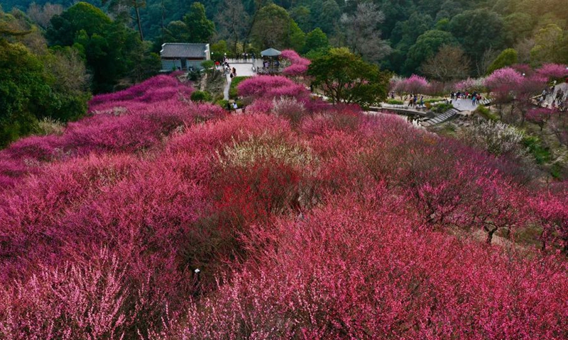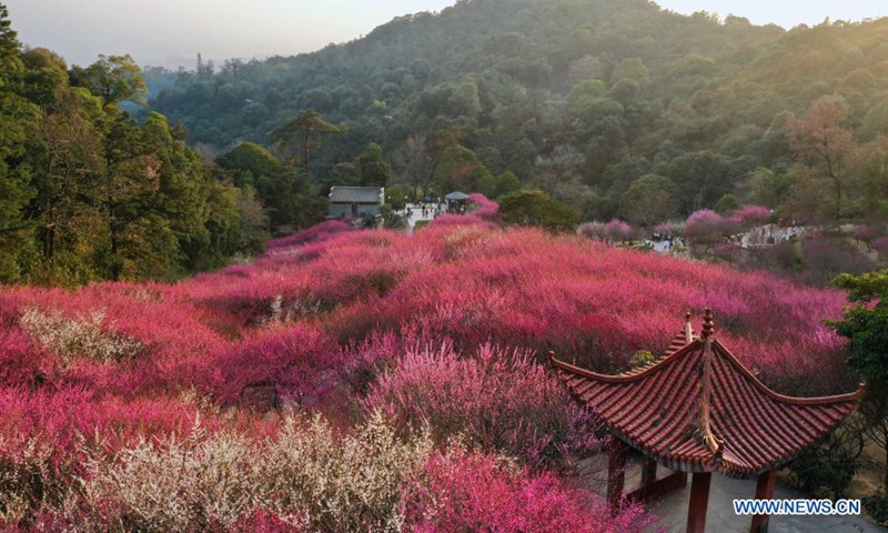 Aerial photo shows scenery of plum blossoms at Gushan Mountain Meili scenic area in Fuzhou, southeast China's Fujian Province, Feb. 1, 2021. (Xinhua/Jiang Kehong)