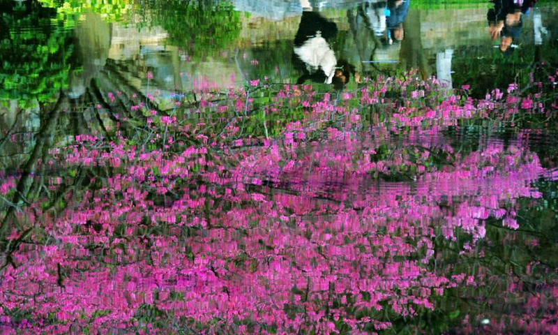 Reflection of cherry blossoms is seen in water in Fuzhou National Forest Park in Fuzhou, southeast China's Fujian Province, Feb. 1, 2021. (Xinhua/Wei Peiquan)