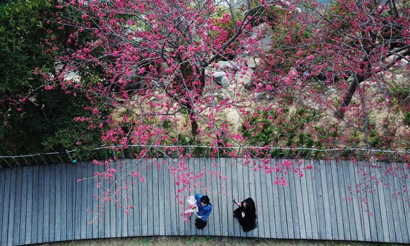 Aerial photo shows visitors enjoying their leisure time among cherry blossoms at Fuzhou National Forest Park in Fuzhou, southeast China's Fujian Province, Feb. 1, 2021. (Xinhua/Wei Peiquan)