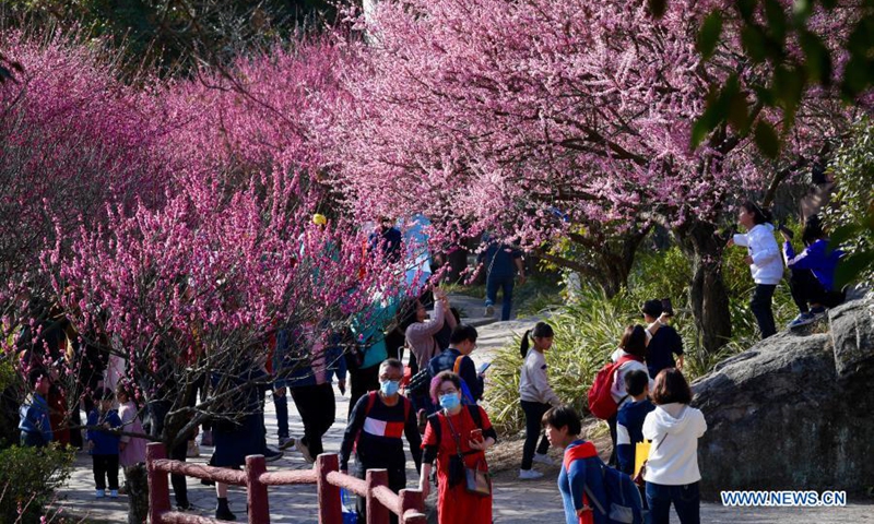 Visitors enjoy their leisure time among plum blossoms at Gushan Mountain Meili scenic area in Fuzhou, southeast China's Fujian Province, Feb. 1, 2021. (Xinhua/Jiang Kehong)