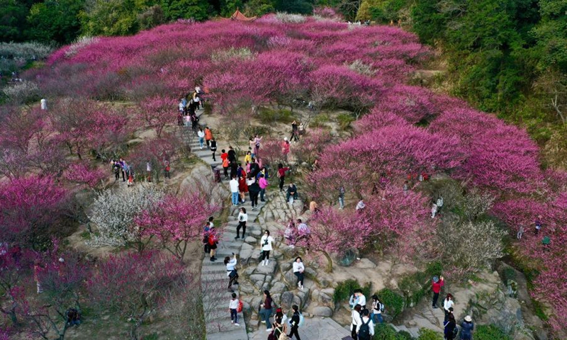 Aerial photo shows visitors enjoying their leisure time among plum blossoms at Gushan Mountain Meili scenic area in Fuzhou, southeast China's Fujian Province, Feb. 1, 2021. (Xinhua/Jiang Kehong)
