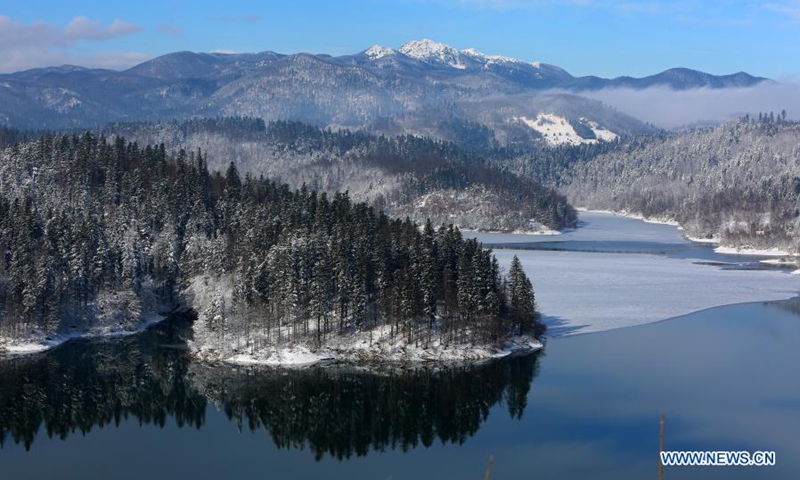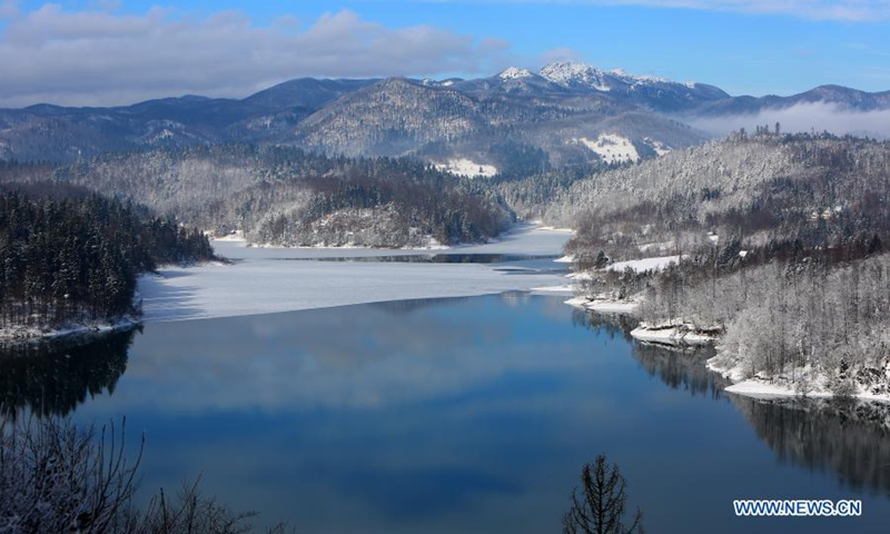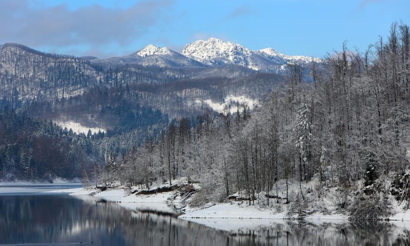 Photo taken on Feb. 1, 2021 shows the winter scenery of the Lokve Lake near Lokve, western Croatia's mountainous Gorski Kotar region. (Kristina Stedul Fabac/Pixsell via Xinhua)