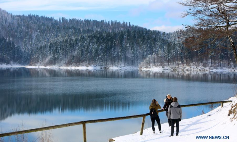 People visit the Lokve Lake near Lokve, western Croatia's mountainous Gorski Kotar region, on Feb. 1, 2021. (Kristina Stedul Fabac/Pixsell via Xinhua)