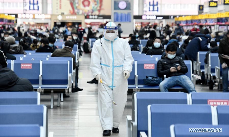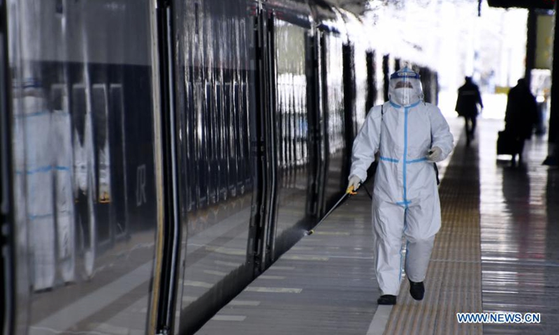 A staff member conducts disinfection process at Beijing South Railway Station in Beijing, capital of China, Feb. 1, 2021. Beijing South Railway Station carries out a series of COVID-19 prevention and control measures to make sure the safety of passengers during the Spring Festival travel season. (Xinhua/Li Xin)