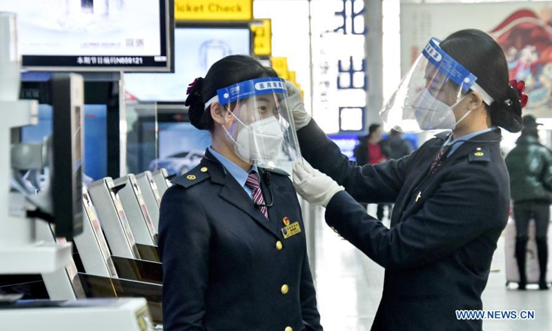 Staff members wear protective face shields at Beijing South Railway Station in Beijing, capital of China, Feb. 1, 2021. Beijing South Railway Station carries out a series of COVID-19 prevention and control measures to make sure the safety of passengers during the Spring Festival travel season. (Xinhua/Li Xin)