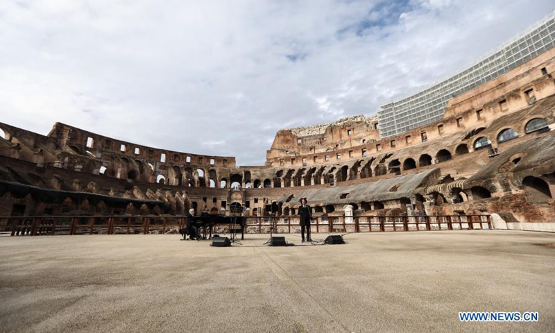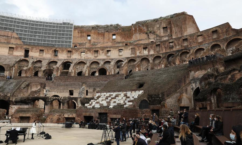 Musicians from the Santa Cecilia academy perform in the reopened Colosseum in Rome, Italy, Feb. 1, 2021. Coronavirus restrictions were eased in most of Italy's 20 regions on Monday after the latest epidemiological picture showed an improving pandemic trend in the country. (Xinhua/Cheng Tingting)