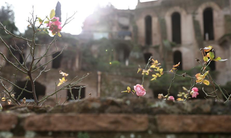 Flowers bloom on the ruins in the reopened Roman Forum in Rome, Italy, Feb. 1, 2021. Coronavirus restrictions were eased in most of Italy's 20 regions on Monday after the latest epidemiological picture showed an improving pandemic trend in the country. (Xinhua/Cheng Tingting)