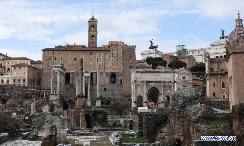 People wearing face masks visit the reopened Roman Forum in Rome, Italy, Feb. 1, 2021. Coronavirus restrictions were eased in most of Italy's 20 regions on Monday after the latest epidemiological picture showed an improving pandemic trend in the country. (Xinhua/Cheng Tingting)