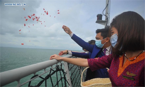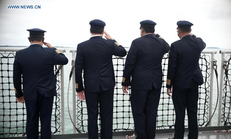 Sriwijaya Air crew members salute to pay tribute to the victims of crashed Sriwijaya Air flight SJ 182 at the deck of Indonesian Navy hospital ship KRI Semarang in waters of Jakarta, Indonesia, Jan. 22, 2021. (Xinhua/Zulkarnain)