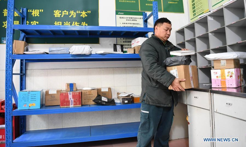 Huang Shihua carries packages at a post office in Chengjia Township of Yangshan County, south China's Guangdong Province, Jan. 29, 2021.(Xinhua/Deng Hua)