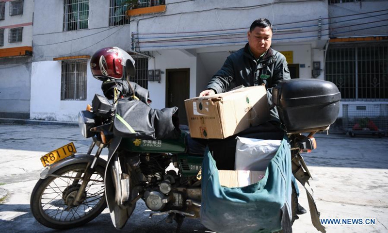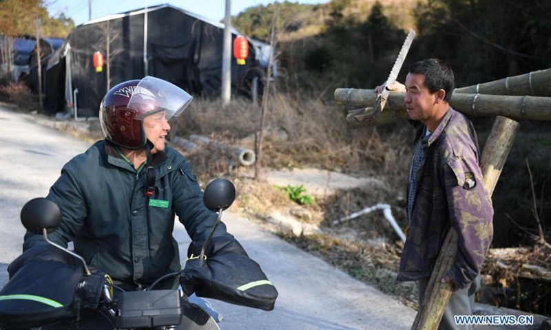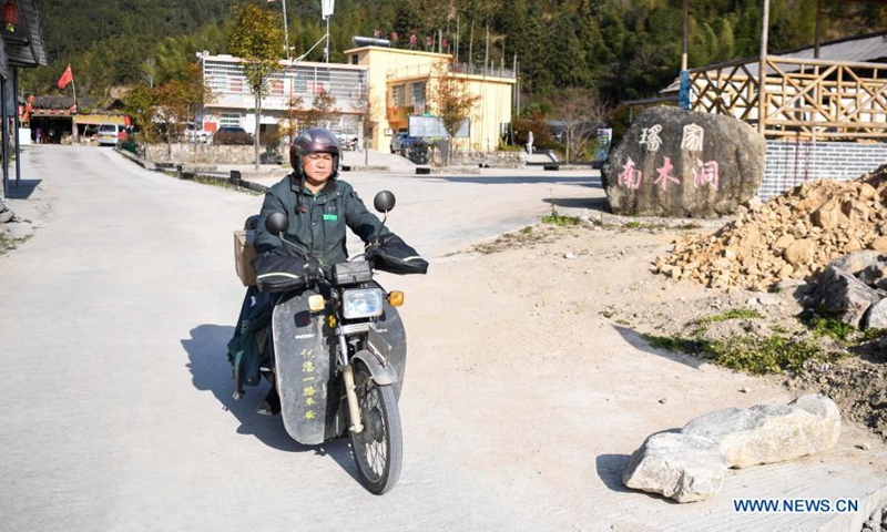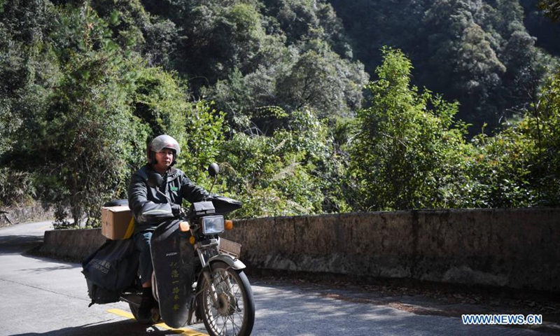 Huang Shihua rides a motorcycle on a road in Chengjia Township of Yangshan County, south China's Guangdong Province, Jan. 29, 2021. Huang Shihua, 44, is a postman in Chengjia Township. Delivering the mail with a motorcycle, he has made a journey of over 1,500 kilometers every month since 2008.(Xinhua/Deng Hua)