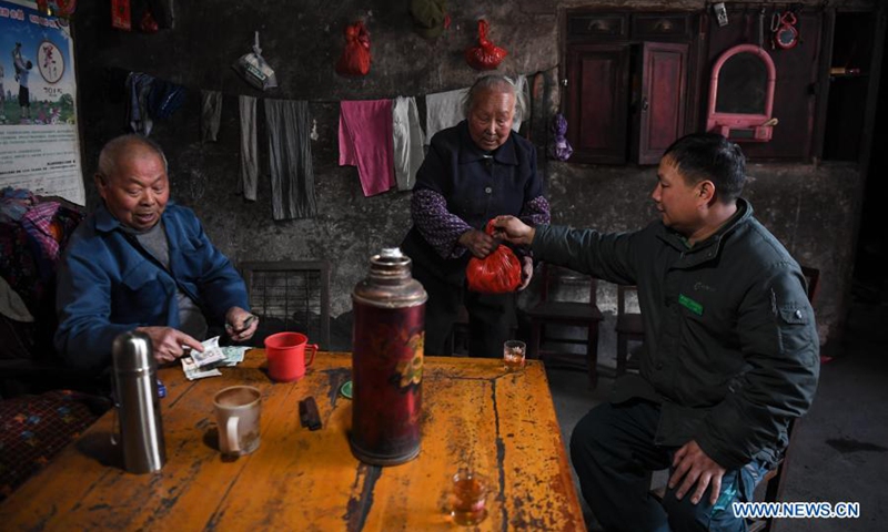 Huang Shihua (R) delivers a package in Chengjia Township of Yangshan County, south China's Guangdong Province, Jan. 29, 2021.(Xinhua/Deng Hua)