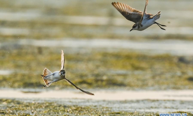 Two lesser sand plovers fly in Hainan Xinying Mangrove National Wetland Park in Danzhou City, south China's Hainan Province, Jan. 18, 2021.(Xinhua/Yang Guanyu)