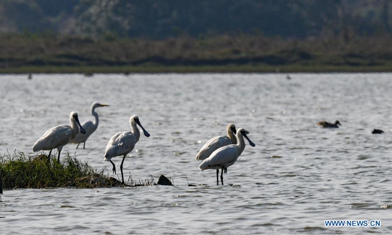 A black-faced spoonbill forages in Panshan Village of Xinzhou Town in Danzhou City, south China's Hainan Province, Jan. 19, 2021. South China's Hainan Island has launched a survey of waterbirds wintering across the island, covering 50 coastal habitats of waterbirds, to better understand their species, numbers and distribution.(Xinhua/Yang Guanyu)