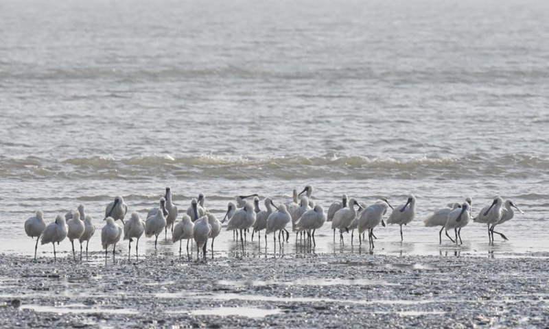 Black-faced spoonbills rest at Dongzhaigang National Nature Reserve in Haikou, south China's Hainan Province, Jan. 13, 2021.(Xinhua/Yang Guanyu)