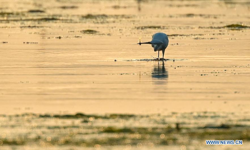 A heron forages at Hainan Xinying Mangrove National Wetland Park in Danzhou City, south China's Hainan Province, Jan. 18, 2021. South China's Hainan Island has launched a survey of waterbirds wintering across the island, covering 50 coastal habitats of waterbirds, to better understand their species, numbers and distribution.(Xinhua/Yang Guanyu)