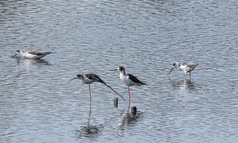 Black-winged stilts are seen at a wetland in Qiugang Village of Ledong Li Autonomous County, south China's Hainan Province, Jan. 17, 2021.(Xinhua/Yang Guanyu)