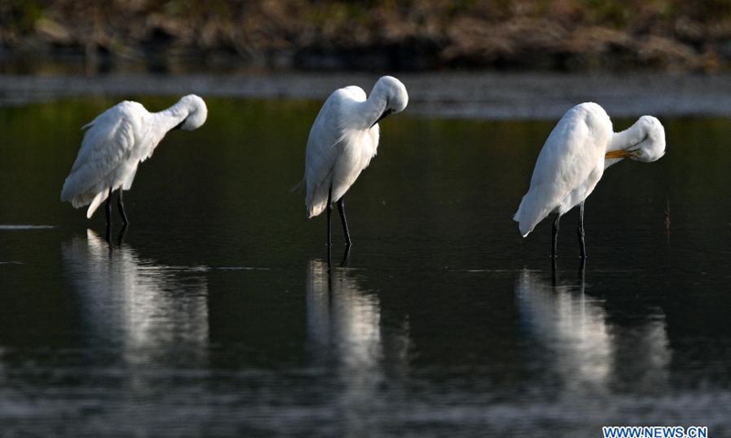 Herons rest in Panshan Village of Xinzhou Town in Danzhou City, south China's Hainan Province, Jan. 19, 2021. South China's Hainan Island has launched a survey of waterbirds wintering across the island, covering 50 coastal habitats of waterbirds, to better understand their species, numbers and distribution.(Xinhua/Yang Guanyu)
