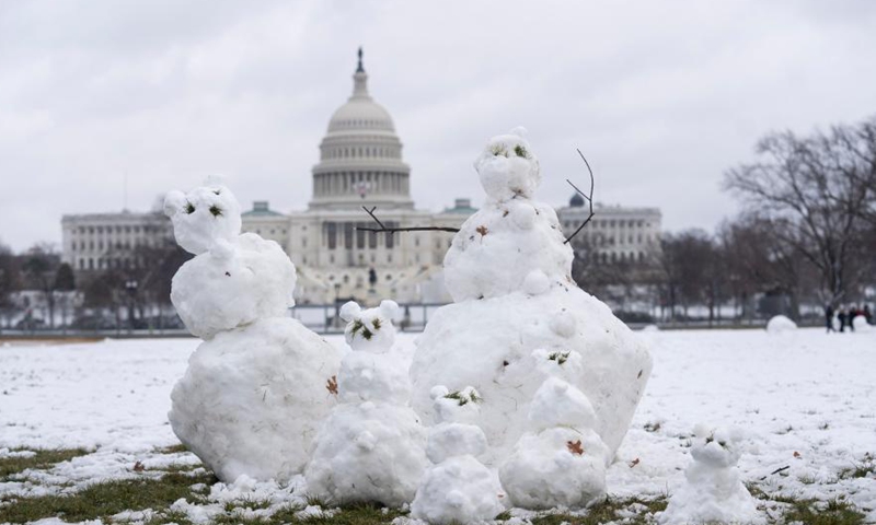 Photo taken on Feb. 2, 2021 shows animals made of snow near the U.S. Capitol building in Washington D.C., the United States. (Xinhua/Liu Jie)