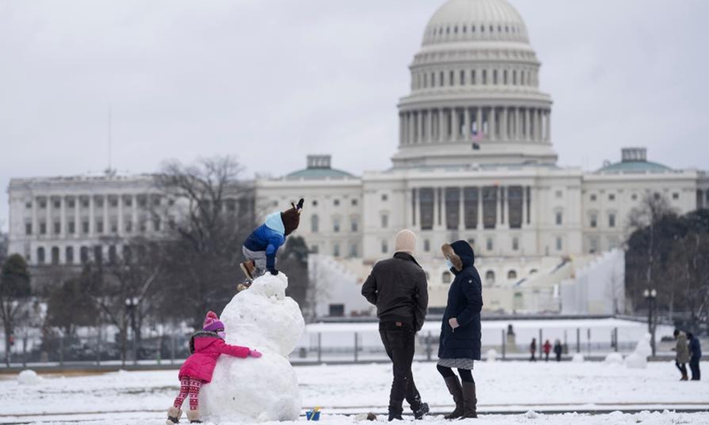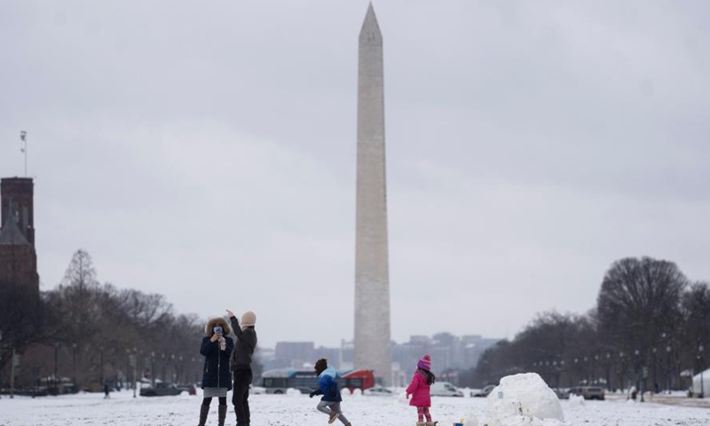 People play in the snow at the National Mall in Washington D.C., the United States, on Feb. 2, 2021. (Xinhua/Liu Jie)