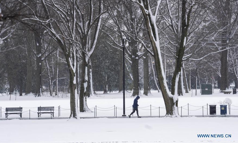 A man jogs in the snow at the National Mall in Washington D.C., the United States, on Feb. 2, 2021. (Xinhua/Liu Jie)