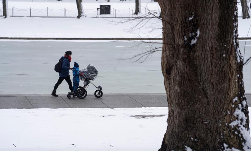 People walk at the snow-covered National Mall in Washington D.C., the United States, on Feb. 2, 2021. (Xinhua/Liu Jie)