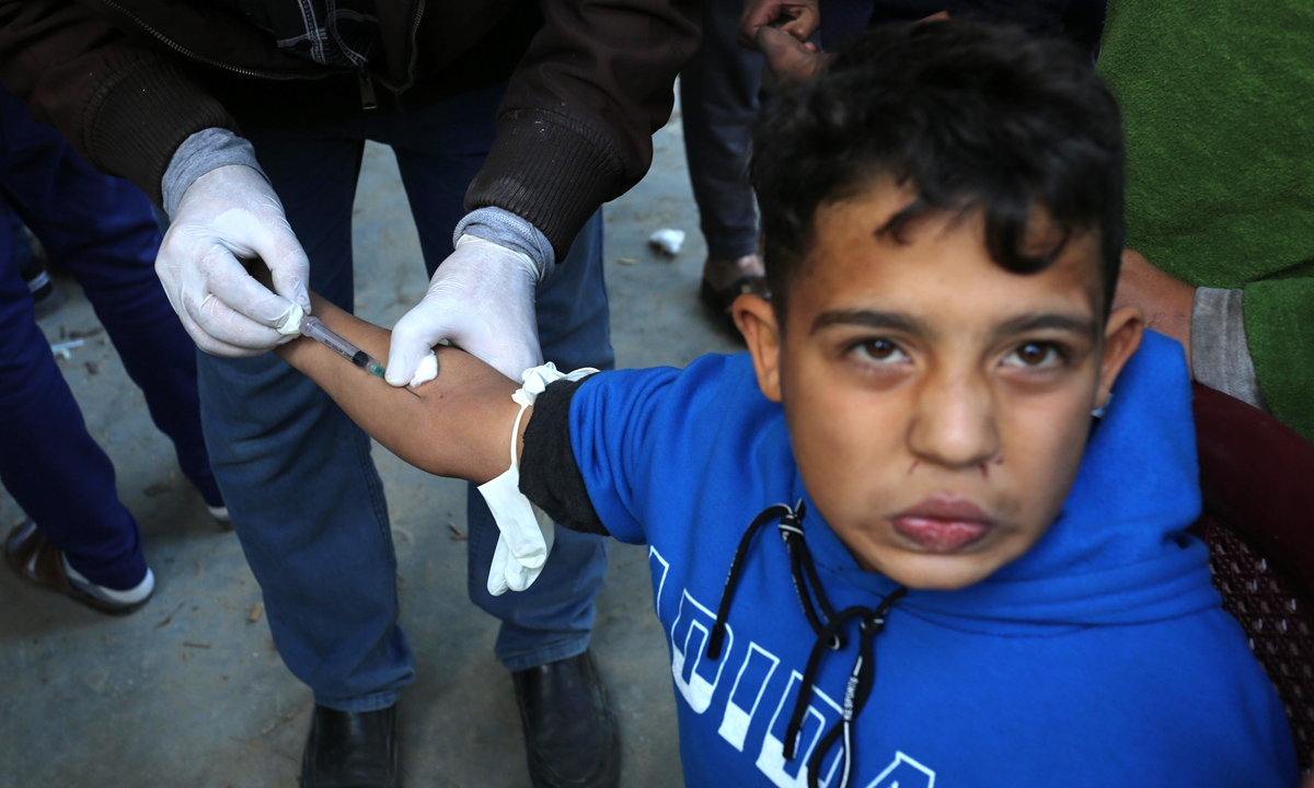 A Palestinian medical worker wearing protective gear, takes a random blood sample, in Deir al-Balah, central of Gaza Strip, on January 30, 2021. Photo: VCG