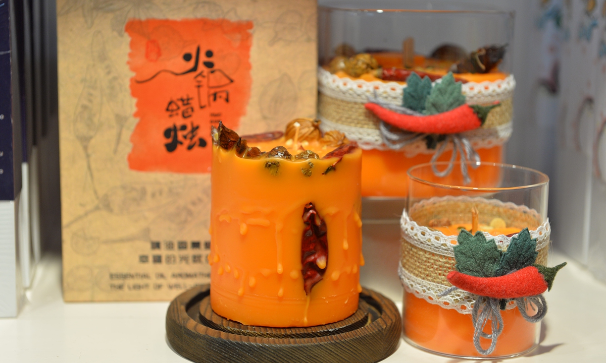 A restaurant in Chengdu, Southwest China's Sichuan Province, promotes a hot pot-scented candle on Tuesday that looks like a solid hot pot ingredient pack. The candle is made of hot pot raw materials such as pepper, Chinese prickly ash, star anise and bay leaf. Photo: IC