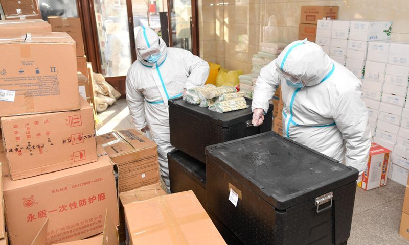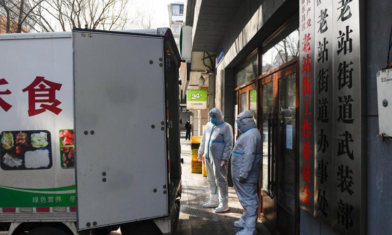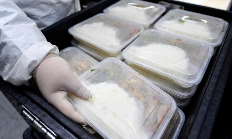 Workers are about to carry boxed meals at a sub-district office in Tonghua City of northeast China's Jilin Province, Feb. 2, 2021.(Xinhua/Xu Chang)