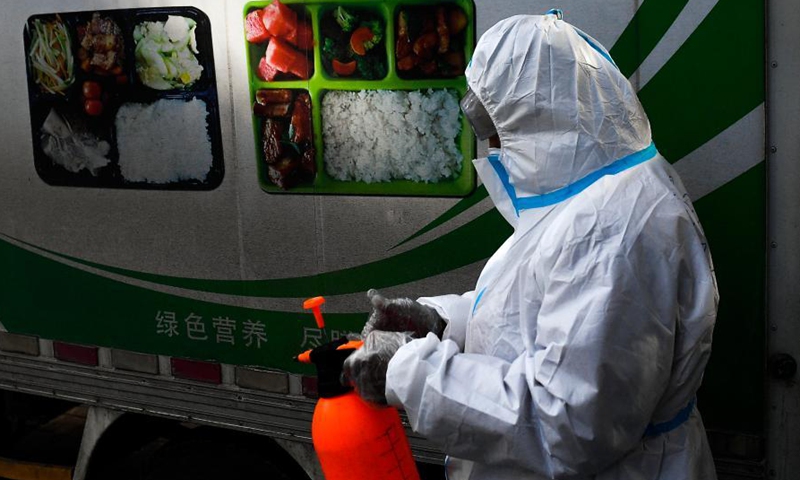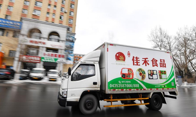 A distribution truck loaded with boxed meals drives on the street in Tonghua City of northeast China's Jilin Province, Jan. 21, 2021.(Xinhua/Xu Chang)