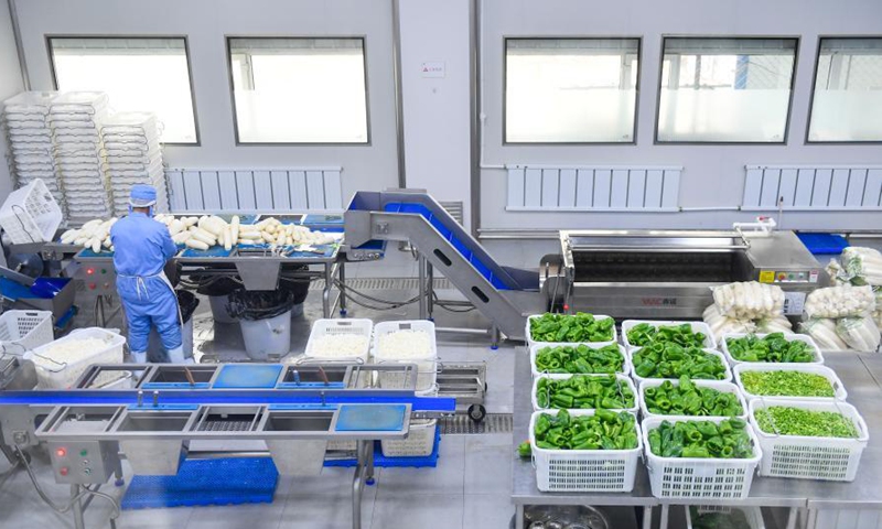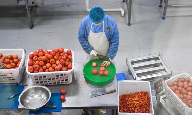 A worker processes vegetables in Jiahe Catering Company in Tonghua City of northeast China's Jilin Province, Jan. 21, 2021. "The city is slowing down to curb the pandemic, but we're not closing up. Instead, we're busier than ever," said Zhao Hongxia, general manager of Jiahe Catering Company.(Xinhua/Xu Chang)