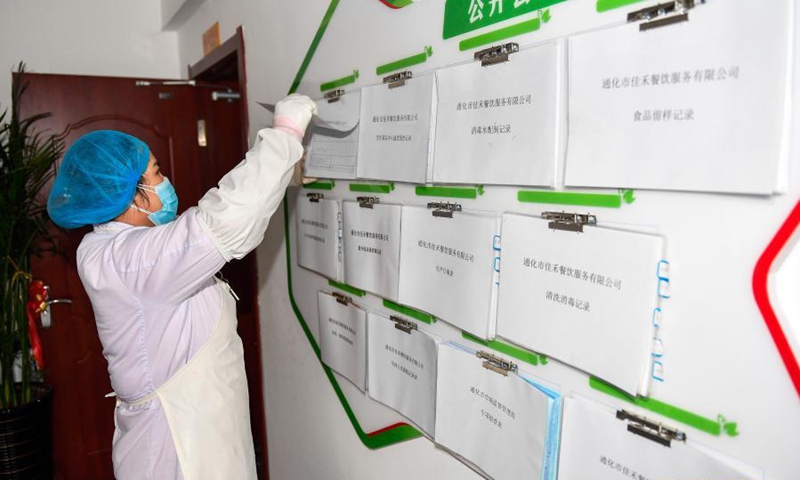 Zhao Hongxia checks the food sample records, disinfection records and the daily temperature of the employees in Jiahe Catering Company in Tonghua City of northeast China's Jilin Province, Jan. 21, 2021. "The city is slowing down to curb the pandemic, but we're not closing up.(Xinhua/Xu Chang)