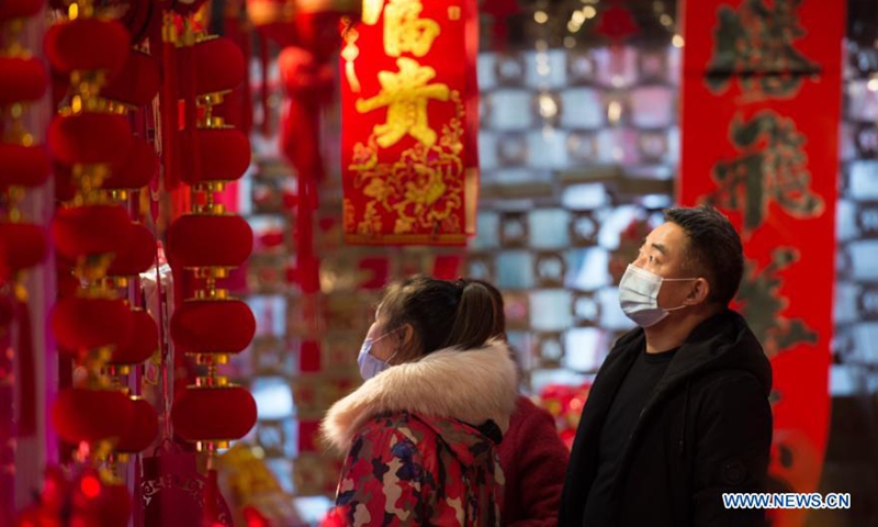 People buy decorations for the upcoming Spring Festival at a market in Xi'an, northwest China's Shaanxi province, Feb. 1, 2021. The Spring Festival, or Chinese Lunar New Year, falls on Feb. 12 this year. (Xinhua/Wei Xiang)