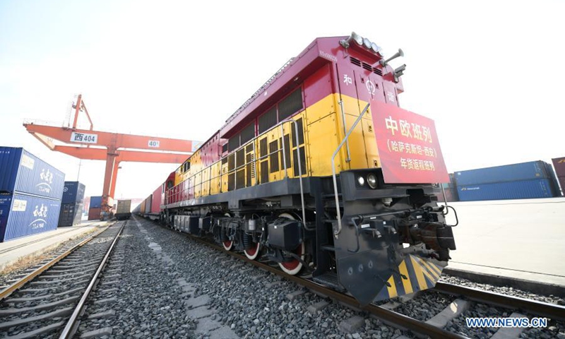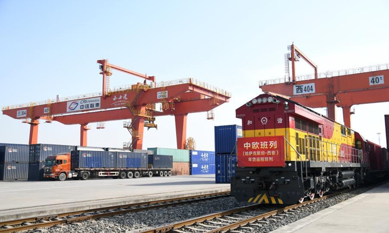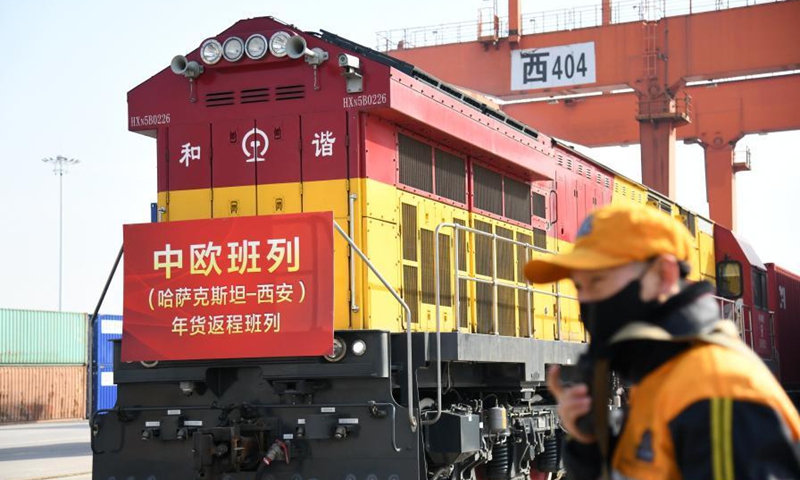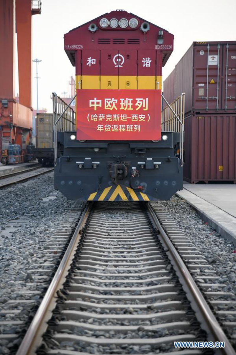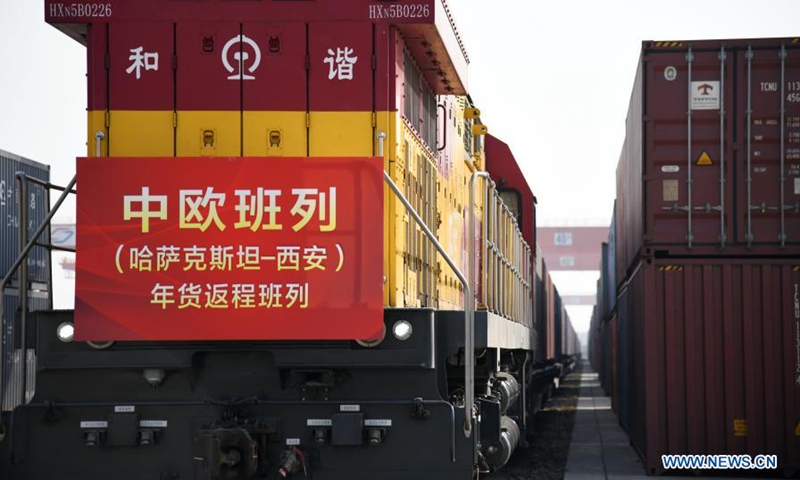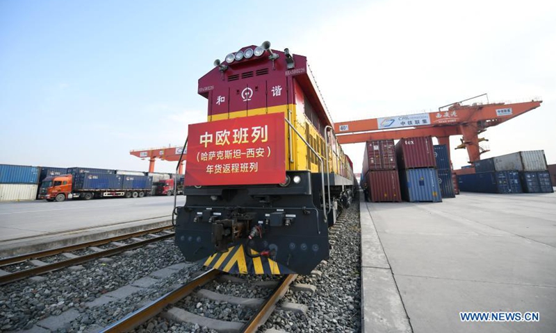 A returning China-Europe freight train from Kazakhstan arrives at the Xinzhu Station of China Railway Xi'an Bureau Group Co., Ltd. in Xi'an City of northwest China's Shaanxi Province, Feb. 3, 2021. The train was fully loaded with commodities for the upcoming Chinese Lunar New Year, such as flour, edible oil, honey and candies. (Xinhua/Li Yibo)